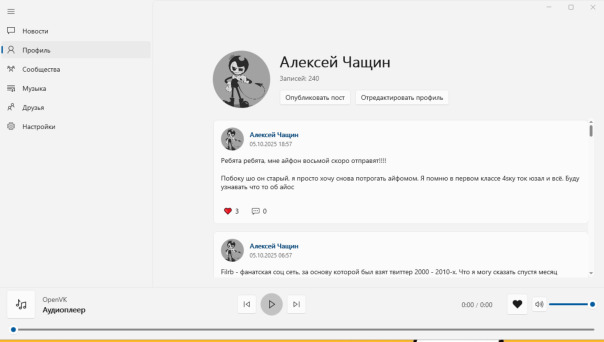 Опыт использования OpenVK Desktop от @fayzetwin. Дизайн мне очень понравился. Минимализм от майков самый лучший как по мне. Как стильный аудиоплеер сойдёт. Раздел "аудиозаписи" мне понравился. Удобно выбирать треки и просматривать их. Ну и посты выглядят современно. По функционалу... Слабенько. Профиль, друзья, новости, аудиозаписи, группы и настройки (в которых ничего интересного нет). Нет мессенджера, раздела "видеозаписи" , так таковой кастомизации, а в группах не показываются группы, созданные пользователем, да и в самом списке показываются лишь 5 групп. При создании поста кроме аудио, видео и фото добавить ничего нельзя. Моя оценка: 8/10. Клиент скучный, но красивый Как только приедет мой айфон, попробую OpenVK Swift (если обнова выйдет и бета тест вернут). |