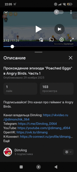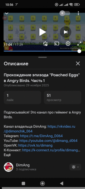 Ну что, ребята, я готов поделиться первыми результатами моего первого геймлея в Angry Birds. Он набрал 51 просмотр на VK Видео и 8 просмотров на Ютубе! ЗА 20 ЧАСОВ!