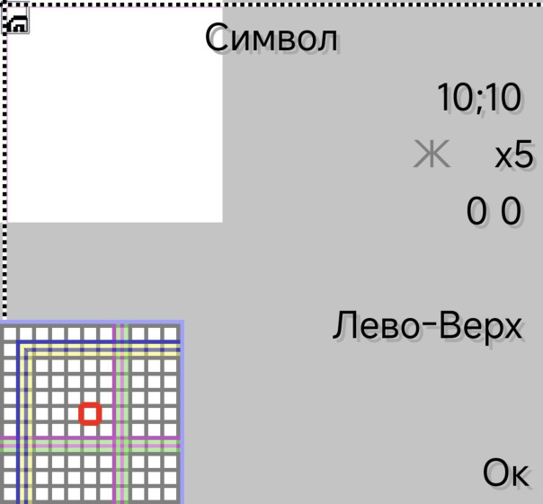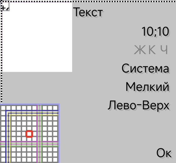 Теперь область увеличения можно поместить в другие окошки. В уже отсмасштабированном ранее окошке AddText инструмента "Текст", например. И тут стало ясно что везде многого не хватает. Нужно еще в этих окошках отображать везде область текущего выделения (и в главном окне рисования тоже), отображать метки, отображать курсор. А при включении области увеличения 11х11 - еще и в ней рисовать область выделения, метки. А на фоновом рисунке сзади тогда жирно рисовать область выделения, метки и крестовину вместо курсора на весь экран. Тогда можно будет вставлять картинки, тексты, указывать цвет и пр. ориентируясь на них, а не только на координаты курсора. Ну это будет в следующем посте. Скриншоты: область увеличения в окне AddText инструмента "Текст" при телефонном и при PCF-шрифте. И еще один телефон добавлен в тестовые - Nokia 7900 Prism, у него другой экран 240х320 и другие (не как у Nokia N90) шрифты. Подробнее на форуме: blackstrip.ru/phpBB2/viewtopic.php?f=4&t=110&p=3556#p3556