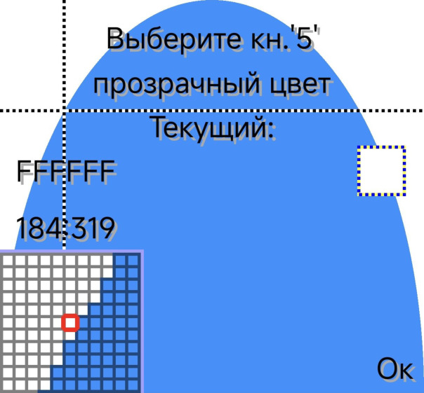 Ревизия окошка Gtc - с помощью него паинткад запрашивает прозрачный цвет с картинки из буфера обмена для Спецвставки (вставка с прозрачным цветом) и Мозаики (текстурирование зацикленным изображением из буфера). Теперь его интерфейс масштабирован и отрисовывается в виртуальных пикселях, а по кнопке "*" включается область увеличения 11х11 пикселей, координаты курсора и большая крестовина вместо мелкого курсора. При этом не показываются метки и область выделения, т.к. они на рисунке, а в буфере - просто картинка.