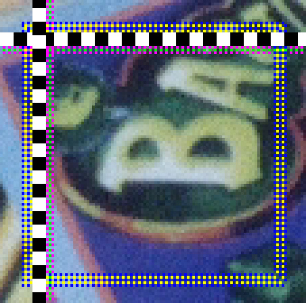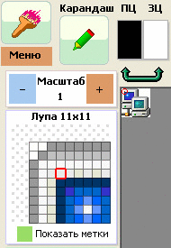 - появляется область увеличения 11х11 пикселей, в ней метки и область выделения жирно рисуются поверх этих 11х11 крупных пикселей,