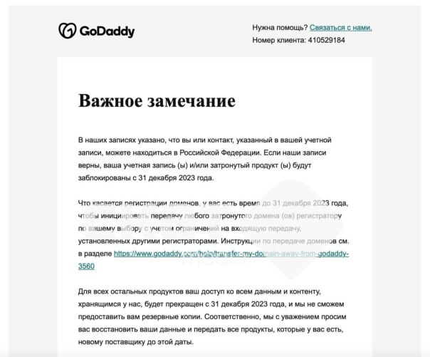 Американский хостинг-провайдер GoDaddy начал уведомлять пользователей из РФ о прекращении работы с ними в одностороннем порядке. Сервис предупреждает, что перестанет оказывать свои услуги после 31 декабря 2023 года.