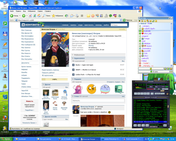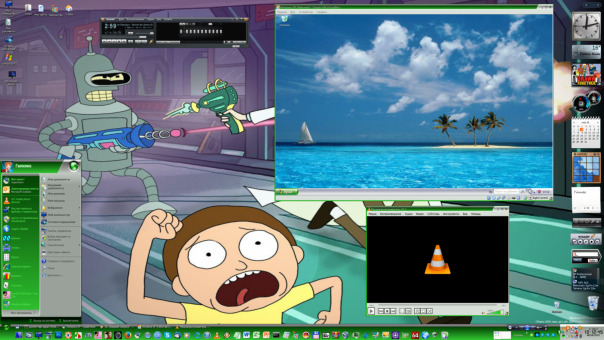7 - Меню пуск, VirtualBox с Windows XP на борту (60гб диск, 512мб оперативы), VLC и Winamp,