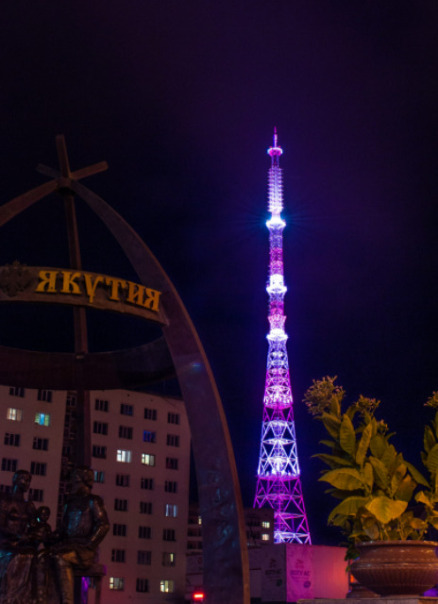 В связи с низкими температурами в зимнее время года концепция подсветки телебашни в г. Якутске выполнена из световых элементов устойчивых к суровым погодным условиям.