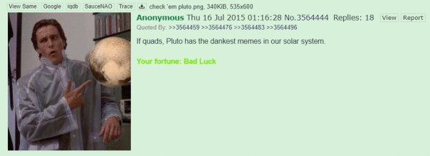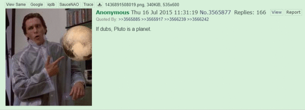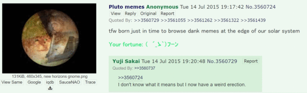 Pluto (is a planet) (14.07.2015) - мем, возникший как реакция на активные всемирные обсуждения о том, является ли Плутон планетой. Исследователи провели качественный анализ и решили, что Плутон - планета, и на ней обитает много мемов.