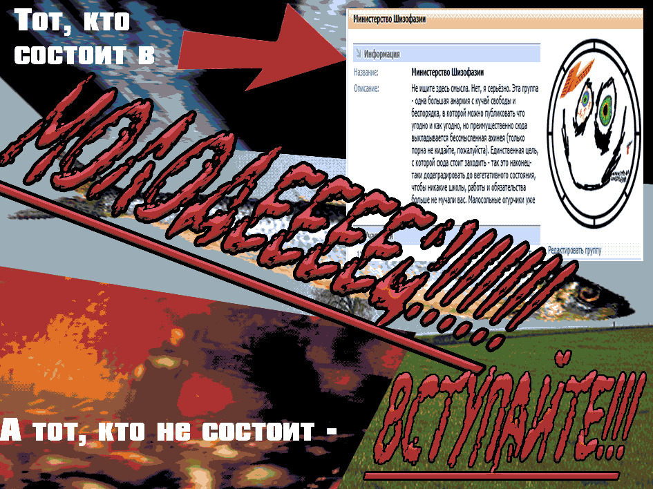 | Описание: | Не ищите здесь смысла. Нет, я серьёзно. Эта группа - одна большая анархия с кучей свободы и беспорядка, в которой можно публиковать что угодно и как угодно, но преимущественно сюда выкладывается бессмысленная ахинея (только порна не кидайте, пожалуйста). Единственная цель, с которой сюда стоит заходить - так это наконец-таки додеградировать до вегетативного состояния, чтобы никакие школы, работы и обязательства больше не мучали вас. Малосольные огурчики уже бегут. |