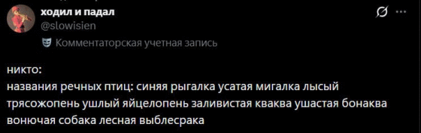 Любимые цитаты: "Никогда не взрослейте, это ловушка"; "Не молчите, жизнь слишком коротка. Много тоже не пиздите, станет еще короче."; "Если у тебя получилось обмануть человека — это не значит, что он дурак. Это значит, что тебе доверяли больше, чем ты этого заслуживаешь."; "концентрация лимонада в магме скрепок давно выше чем юпитер в ручье канализации"; "Душа хочет романтики, а жопа приключений"; "Не всё то солнышко, что встаёт"; "Как бы вам не казалось, но я всегда за то, чтобы выбор человека был выше моих желаний"; "девушки — это шутка какая-то"; "Смех смехом, а очко кверху мехом)"; "оскорблимент"; "В любом конфликте виноваты оба (полушария твоего мозга но не я.)"; "Я забыл оригинальное значение слова пидорас"; "Моя соль это глутамат натрия"; "Это же надо так испортить настоящее, чтобы люди мечтая о будущем, хотели вернуться в прошлое...."; "Хотели обнову, а получили основу"; "Стильно, динамично, охуительно"; "Скажем дружно — нахрен нужно?"; "Ох уж этот реальный мир со всеми его физическими огранич…