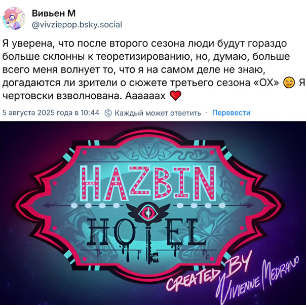 📃 Судя по заверениям cамой Вивьен с её BlueSky, 2 сезон Хазбина (в том числе и после своего завершения) позволит фанатам выстроить ещё куда больше новых, различных теорий и предположений. Также она преподносит сюжет 3 сезона, чем-то вроде «неожиданного поворота»💥