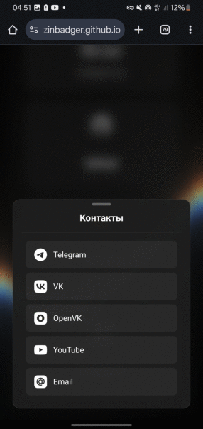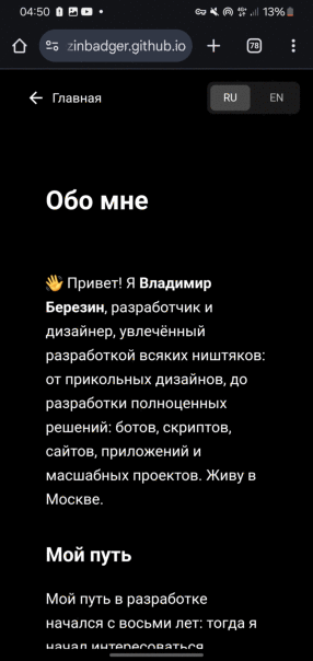 Обновил сайтик: внёс коррективы, добавил "Новости" вместо "Проекты" (а зачем, когда есть "Обо мне" и дофига ссылок на мой гитхаб), добавил переключение темы (светлая/тёмная) и прочие мелкие изменения. Не идеально получилось (не подкрутил "Контакты" под темы), но оцените. На всякий: если не обнаружите изменений, попробуйте почистить кэш браузера. |