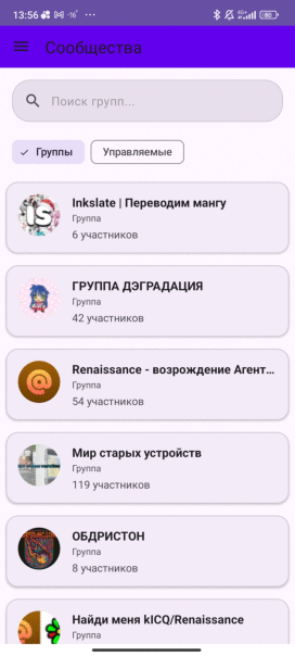 - рабочий раздел со списком групп и возможность просматривать их (2-3 фотографии)