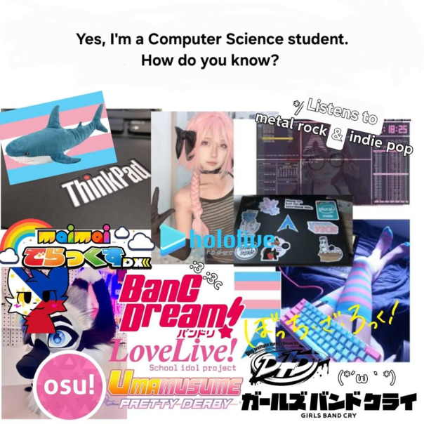 | Любимые ТВ-шоу: | Urasekai picnic, Non non biyori, k-on!, Bocchi the rock, cyberpunk: edgerunners, lucky star, Madoka Magica, kill la kill, Trigun, Soul eater, made in abyss, No game no life, JoJo, Girls' last tour, Hellsing |