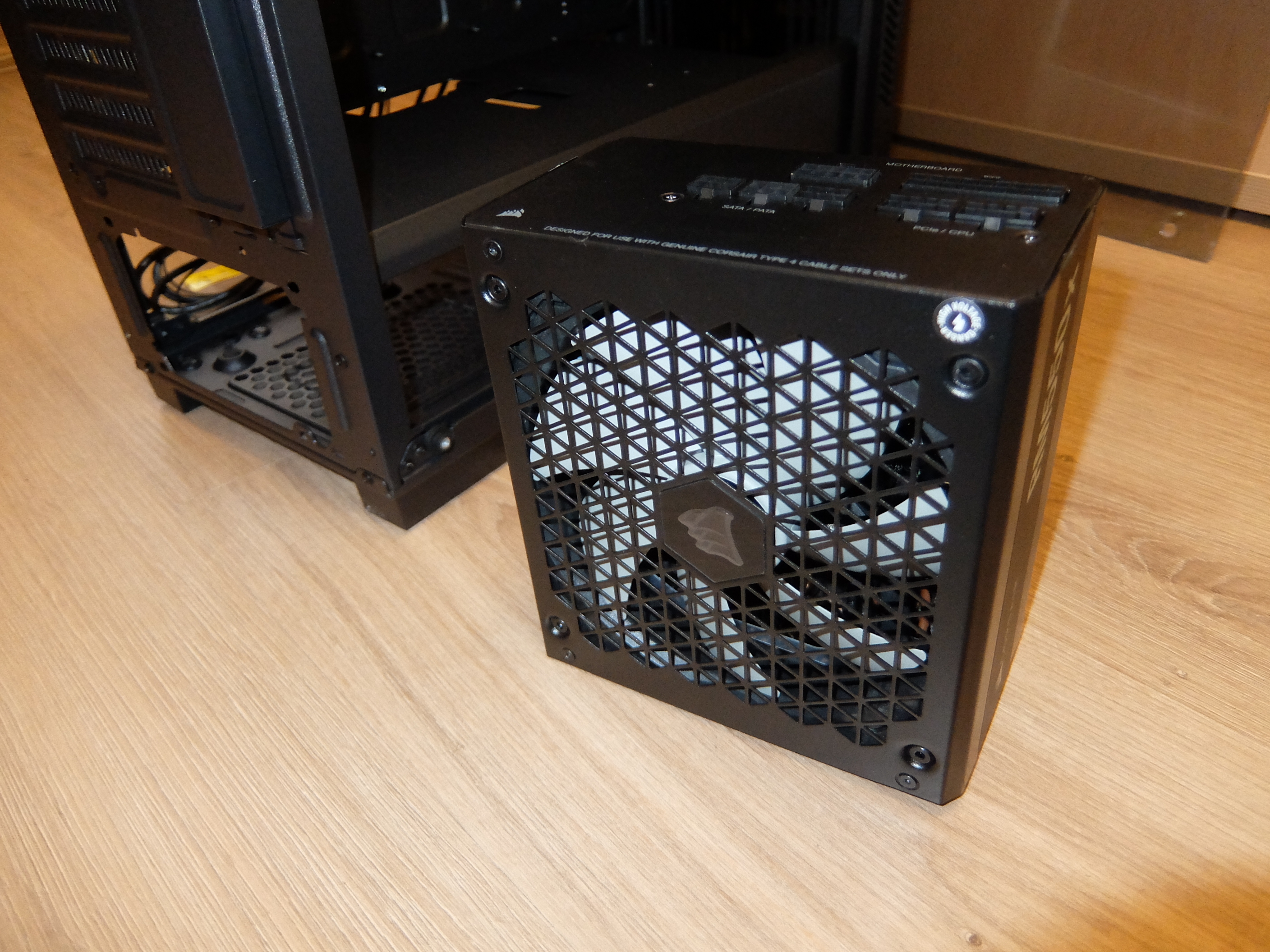 Блок питания с полупассивным режимом: при нагрузке до 220 Вт вентилятор не крутится вообще. Раньше я на блоках питания экономил, считая, что они не влияют на производительность, и это оборачивалось тем, что они были очень шумными. Поэтому когда озаботился вопросом тишины, решил, что тихий блок питания будет обязательной частью компьютера-мечты. С этого блока и началась сборка. Хотя казалось, что поставить его на место в корпусе (оно тоже видно на фото) будет легко, но это впечатление было обманчиво. Из-за того, что блок — модульный, провода упирались в корзину для HDD, которую пришлось откручивать и пермещать назад настолько, насколько это возможно. Но установлена она была изначально криво, поэтому пришлось приложить немало усилий, чтобы открутить один из её винтов.