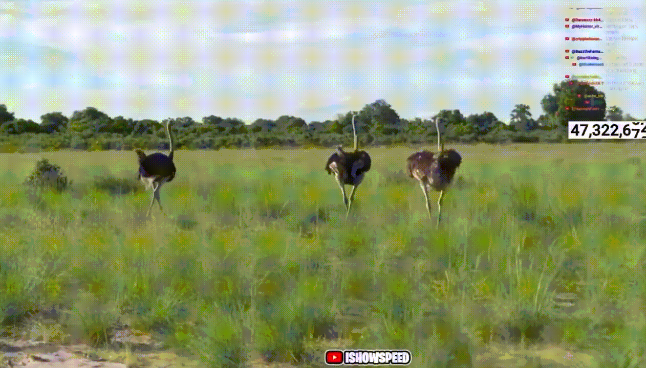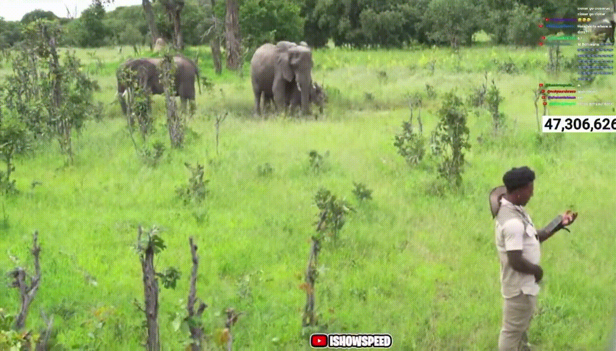 ![]() Спид за время стрима пытался догнать жирафов, оленей, страусов. В один момент стример и его группа подобрались к слонам, один из которых начал бежать в их сторону. |