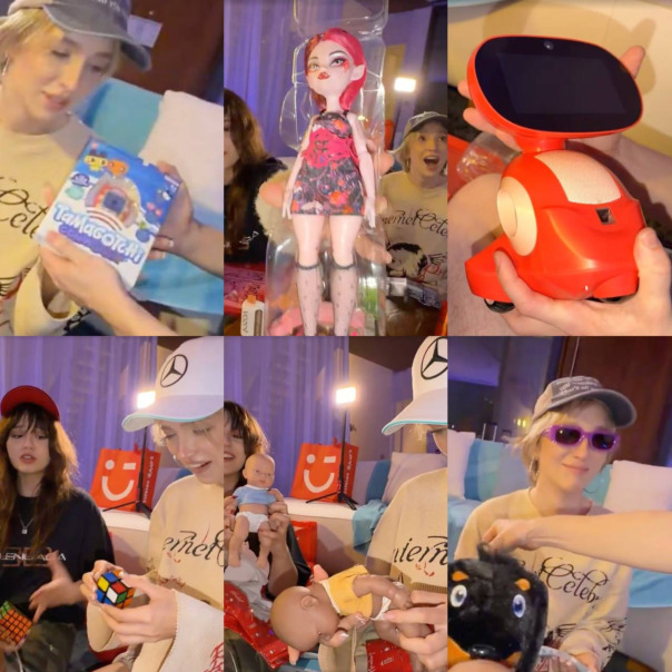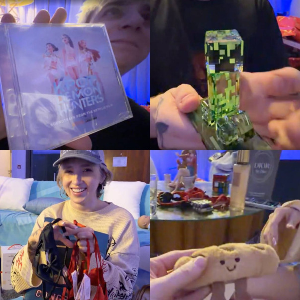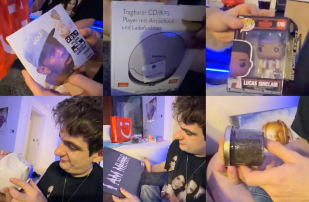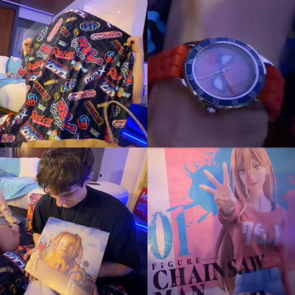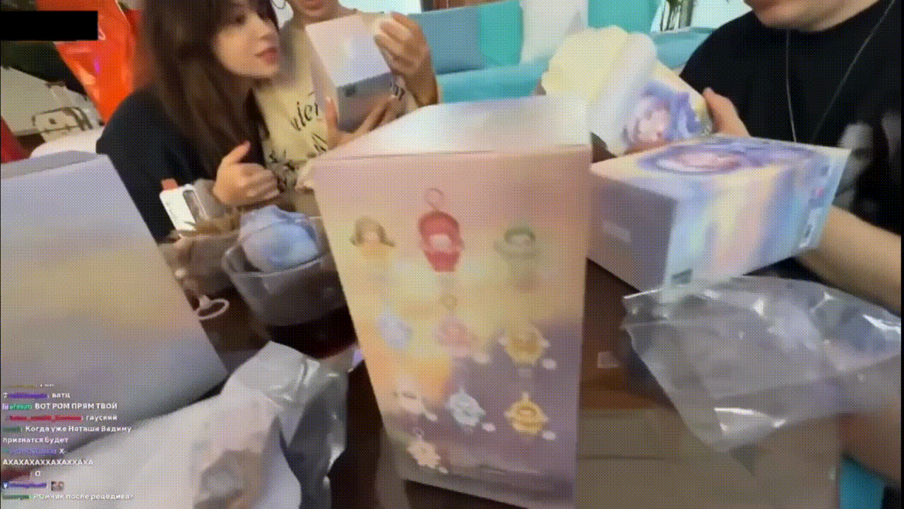 Сначала ребята распаковывали рандом-боксы от PopMart и Miniso — Рома достал самых желаемых кукол из коллекции SkullPanda. Затем они перешли к основным подаркам. Вадим подарил Наташе: поющую собаку, тамагочи, робота-компаньона и сумку Goyard. Даше: «трендовую игрушку», куклу, сумку Hermes и кроссовки. Рома подарил Наташе и Даше: кепки с логотипами автомобилей, кубик Рубика, пупсов и очки, а также Даше сумку Goyard. Вадиму: форму Роналду с автографом. Даша подарила Вадиму: плед в стиле «Тачек», часы в стилистике «Человека-паука», винил Трэвиса Скотта и фигурку из «Человека-бензопилы». Роме: крипера Swarovski и диск с K-pop музыкой. Наташе: нижнее белье, книгу Dior и брелок-батон. Наташа подарила Вадиму: тарелку (которая напомнила ему о нём), калькулятор, виниловую пластинку и банку чёрной икры. Роме: набор музыкальных дисков с плеером, Funko Pop-фигурку по «Очень странным делам», массажный ролик. Даше: приятные мелочи и косметику. В завершение ребята поужинали и продегустировали острые добавки. |