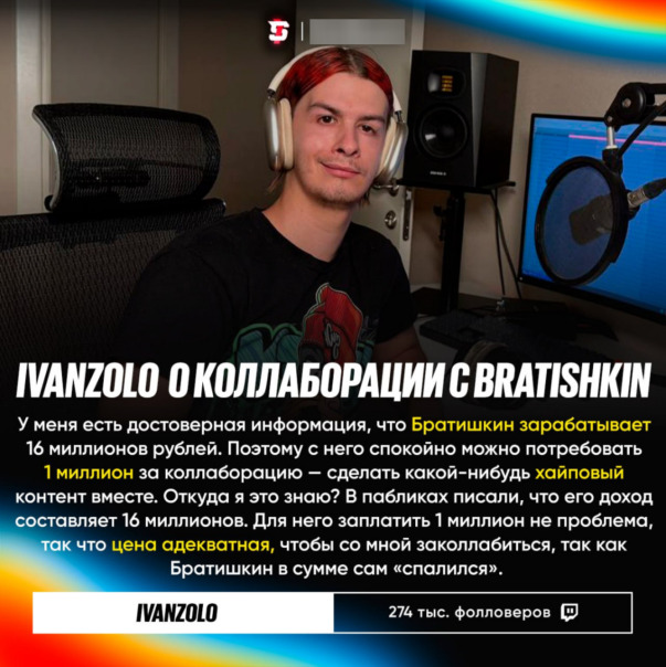 По словам Ивана, за совместный контент Братишкину придётся заплатить 1 млн рублей, ведь ранее (ovk.to/wall-4540_2742) он «спалился» со своим доходом.