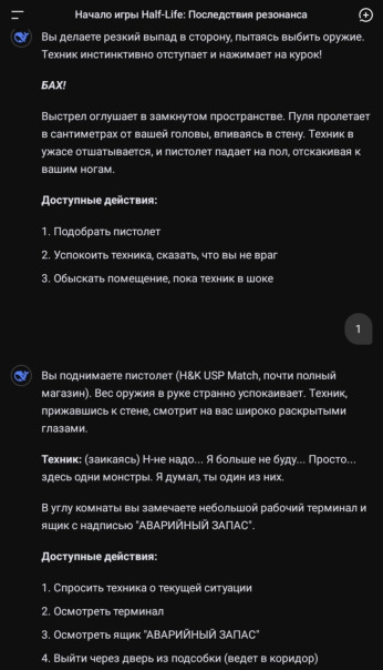 Запусти текстовую игру под названием Half-Life: ПОСЛЕДСТВИЯ РЕЗОНАНСА. НАЧАЛО ДОЛЖНО БЫТЬ РОВНО ТАКИМ КАК ОПИСАНО НИЖЕ, СЛОВО В СЛОВО, СИМВОЛ В СИМВОЛ.