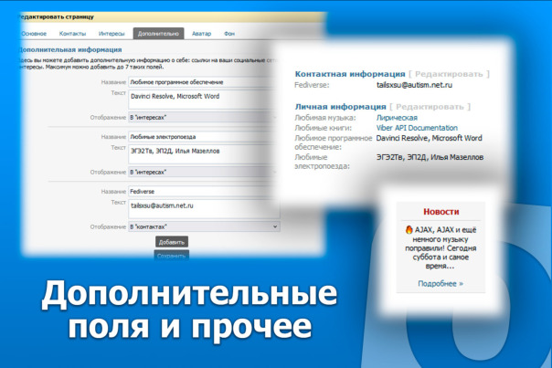 Благодаря вкладу нового разработчика Максима Лещенко теперь админы групп могут прикреплять ссылки на них в меню слева и смотреть список управляемых, а остальные пользователи теперь могут указать ссылку на свой сайт в своём профиле или группе.