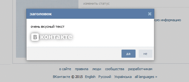 showFastBox('заголовок', 'очень вкусный текст<br><br><img src="vk.com/images/logo.png" style="filter:drop-shadow(0px 0px 5px #4d4d4d);" />', 'да', () => {alert('yes');}, 'не', () => {alert('no');})
