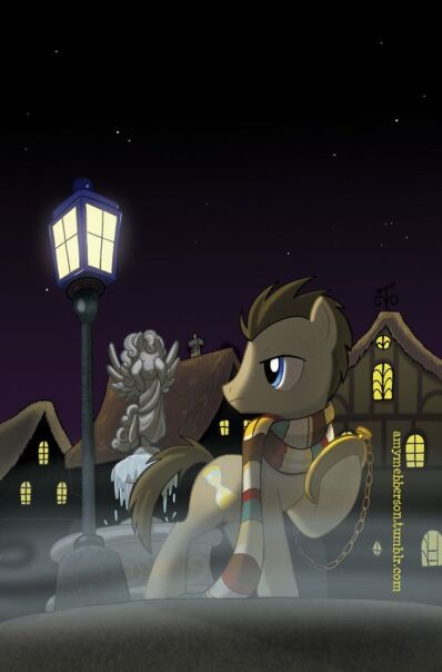 А вы знали, что доктор так-же побывал в MLP?! История создания неизвестна, однако я считаю его добавили как отсылку к великому сериалу. Появлялся он не один раз и не в одном образе, в самом сериале он несёт не привычное нам "Доктор" а "Тайм Тёрнер". Когда фанаты Доктора заметили этого пони, тут же смекнули, что его грива ну ОЧЕНЬ напоминает 10го доктора. А на то, что это сам Доктор или повелитель времени указывает его кютимарка: Песочные часы. Первый раз он появился в первом сезоне поней, сначала как трёхстепенный персонаж для бэкграунда. Позже в пятом сезоне ему ДАЖЕ диалоги прописали!