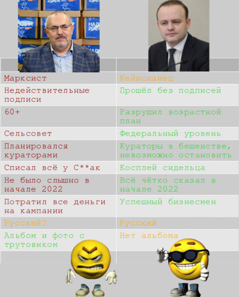 Ну вот вам, 7 процентов, была борьба равная, был тот кто против и за, плюрализм мнений. Вы аморальный банкрот раз не признаёте это. Ну не повезло, вы ещё молодые, шутливые. Леонид, 8 процентов, поздравляем со вторым местом. Что, Надеждин? Зачем ему участвовать в этом фарсе, он вложил какие-то пачки с подписями с заводов, отдыхает на Канарах сейчас. В следующих выборах губернатора уступит уже пяти ноунеймам без фото.