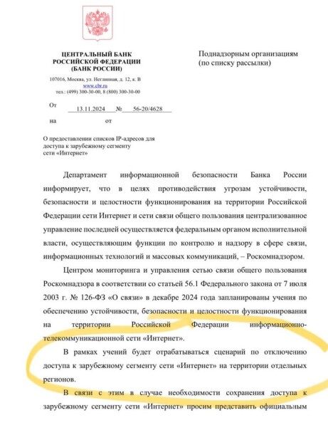 По информации профильных Telegram-каналов, в декабре 2024 года ожидаются учения по «выключению международного интернета» в некоторых регионах РФ. Об этом мероприятии РКН сообщил банкам ЦБ РФ.