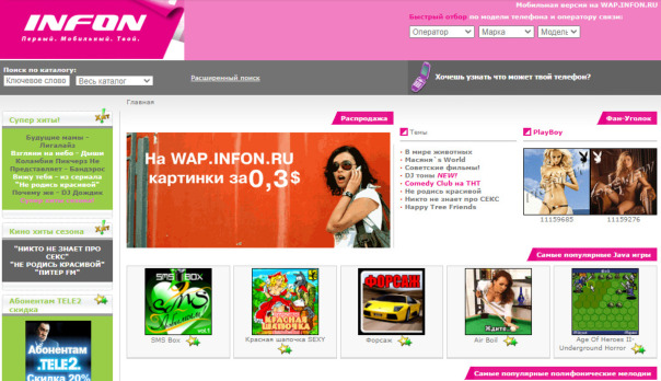 На сайте INFON можно было скачивать и заказывать через SMS обои для мобильных устройств, картинки, мелодии, java игры и многое другое. В середине "нулевых" был запущен "ТВ-ЧАТ ИНФОН" - ovk.to/wall-3300_67 пользователи сайта могли отправлять сообщения прямо в эфир телеканала, где транслировался чат, позже такая возможность появилась и у абонентов мобильных сетей посредством sms-сообщений. Большой популярностью пользовался WAP (мобильный интернет) сайт, куда можно было заходить с мобильных телефонов с поддержкой GPRS/WAP.