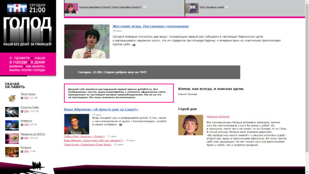 На сайте "Голода" можно было следить за участниками 24/7 через web-камеры, установленные в их доме. Сайт вёл календарь и дневник шоу, где ежедневно публиковались события, происходящие с участниками, а также различные видео, и аудиоматериалы. Архив сайта первого сезона можно найти и сегодня, по ссылке: www.golod1.ru/. Сайт второго сезона также функционирует по своему изначальному адресу.