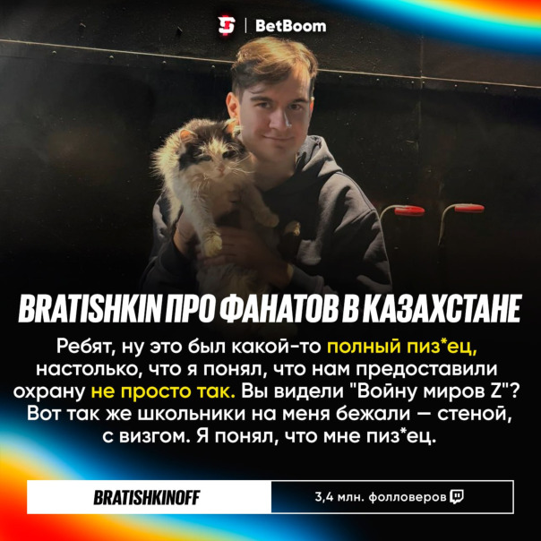 ![]() Он рассказал, как местные подписчики буквально задарили его — пивом, едой, футболками, национальной одеждой. Однако настоящий шок у него вызвали казахстанские школьники, которые сносили заборы, визжали как на концерте и буквально штурмовали отель, где жили стримеры и киберспортсмены. |