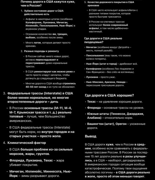 ![]() "Какое-то бетонное говно вместо асфальта, колдобины, везде трупы животных, тачки в кюветах, покрышки. В Орегоне я чуть не вьебался в диван лежащий посреди трассы. На развязках Сан Антонио в час пик поседели мои волосы на жопе. Ужас, блядь. Если раньше я даже думал, что дальнобой по США это романтика, то теперь мне тех кто тут ездит просто жаль. Про стиль вождения в некоторых штатах вообще молчу, так как не хочу опять сказать лишнего, но, блядь, есть места где водят так, будто спецом хотят тебя убить, протаранить, перестроиться тебе в ебало." |