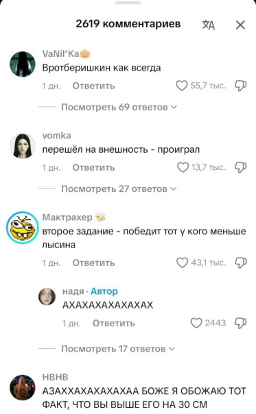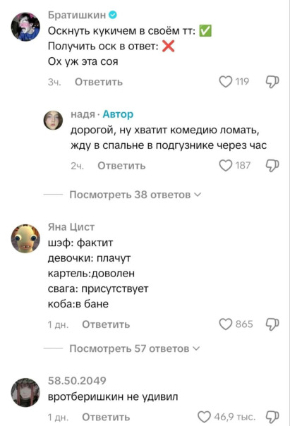 ![]() "Фэтшейминг — это действия или высказывания, которые унижают, высмеивают или оскорбляют человека или группу людей за ожирение." Конфликт начался после того, как тиктокерша выложила видео, где назвала Братишкина "кук*лдом": «Видос был про вечеринки только для женщин, где женщинам спокойнее и безопаснее, но пришел сусси кукло... кукла... кук*лд короче братишкин» в ответ на его комментарий (ovk.to/video8292_336), из-за которого начался прошлый его конфликт. «Не ешь меня, и медийно тоже» — написал Братишкин под видео. Видео набрало больше 600 тыс. просмотров. После комментария Вовы под видео тиктокерши многие усмотрели насмешки над её внешностью. Теперь Вову «отменяют» уже во второй раз за последние недели. |