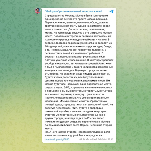 "Москву сейчас может выбрать только полный идиот, город скатился и стал сточной ямой. Не советую переезжать. Жить будете в оверпрайс пиковской коробке, а во всех соседних квартирах будет по 20 иностранных специалистов. Хз как в других городах, но когда ездил по России видел похожие тенденции везде. Из европейских к Москве по помойности ближе всего Париж. Берлин на втором месте."