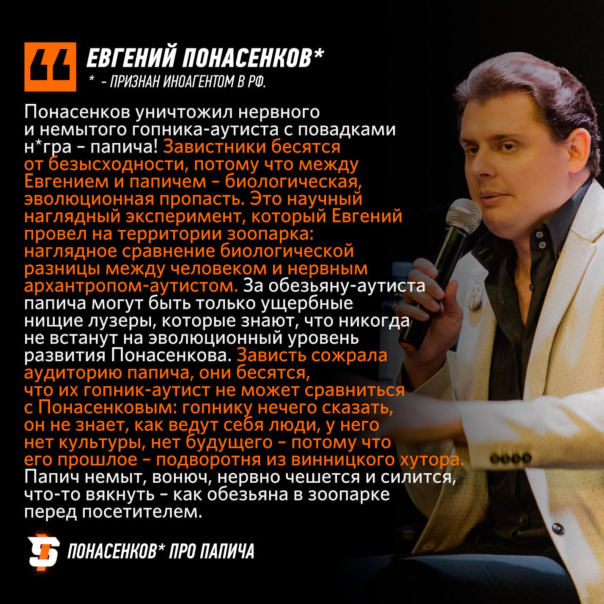 "Папич – трусливая тля, предатель своей страны, беглая дешевка, сидевшая в психбольнице. Евгений живет в Москве, часто бывает в Риме, в Париже, в Монако. А лузер с негритянскими особенностями трусливо сбежал из своей страны, из Украины – кроме азиатского отстойника уже нигде быть не может (только в качестве предмета в зоопарке). У папича – есть хозяева, которые ему говорят возле чьих ног посидеть, как одеться и т.д., он раб, а Евгений – хозяин по своей природе. Принцип Евгения – смело вступать на территорию агрессивного неприятеля, показывая его аудитории разницу уровней: и спасая тех, кто способен понять разницу и начать новую жизнь. Все должны знать свое место в жизни: и с галушкой вместо мозга и совести папич никогда не сможет даже приблизиться не то, что к гениальному ученому и режиссеру, но даже к его общеэволюционному уровню развития. И вас всех сам лузер-папич и его банда обманули! Они трусливо вырезали 10 минут интервью Евгения – в самом начале, где высмеиваются азиатские арабские делишки: папич трус и обманул, кинул вас - собственную аудиторию, лузеров. Так что требуйте его и его кукловодов к ответу – пусть покажут вам полную версию интервью Евгения! Пишите гопнику: «трус, отдай наши 10 минут!» И факт прост: помощники Евгения сказали хозяевам папича удалить ролик только по причине того, что их предмет не сидел в нормальной позе и пришел немытым. А сами попытки папича вякать, естественно, оказались провальными, и он показал, что совсем быдло. Ему же лучше этот срам не показывать. Всем видно, что один – на уровне, другой – неопрятная селючка. Смотрят папича аутисты и неудачники, чтобы как-то себя успокоить, что они не одни неудачники и аутисты. Если вы немытый лезур, нищеброд, ущербный гопник с обезьяньими повадками, подлец и беглый трус – тогда ваше место в обезьяннике папича, если вы Человек и Личность с будущим – вам с Евгением" * — признан иноагентом в РФ. |