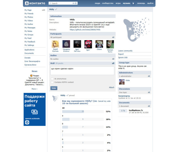 Многие уже успели заметить то, что VKify появился как тема OpenVK! При её использовании рекомендуется выключить юзерскрипт и стиль отдельной темы. Встроенная в OpenVK тема привносит некоторое количество изменений страниц, будь то профиль пользователя или сообщества, или же страничка пополнения баланса.