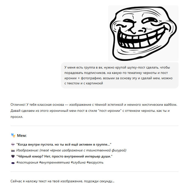 С этой минуты сегодня все мемы в эту группу делает chatgpt, спасибо за ваше внимание к этому вопросу!