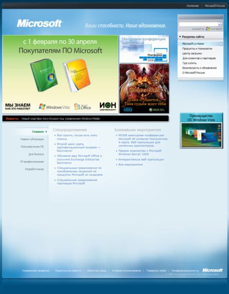вот так выглядела главная страница сайта microsoft в 2007-2008 году