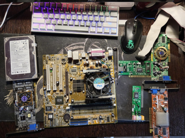 неоченьКраткая предыстория: Пишет мне одногруппник что нашёл в кустах (Кек) компьютерное железо разбросанное и один комп, я конечно же ракетой притопал туда. Там было 2 дохлых материнки на Socket 370 (Одна была отвальная, вторая убитая в хлам) и одна на Socket 7, от какой-то забытой богами китайской фирмы, на Intel чипсете. Кароче она дико глючила, и это был ранний сокет 7, поэтому ни о каких пентиум MMX речи ни шло, а был у меня только AMD K6, пришлось заказать с авито Pentium 100 MHz без MMX. Вставил, заработало. Но там были какие-то глюки с Dallas и памятью, иногда заводилась, но раз в 30 минут. В конце концов мать вообще перестала подавать пост коды... Потом, я нашёл в лабе вот эту материнку которая на фото (Вернее целый комп, но вынести его под ручку я не мог, и пришлось выносить кусками. Мать, хард, сидюк. Ток БП и корпус остались), там она работала идеально, но дома, почему-то, очень дико сбоила, были ошибки в чтении/записи по IDE, ну я её и положил дальше на полочку. А после поездки в Питер, добрый админ проекта Digital Vintage подогнал мне целый пакет ретро-добра, перечислять не стану, и так пост длинный уже. Ну кароче там была тоже мать на сокет 7, НА ТОМ ЖЕ САМОМ ЧИПСЕТЕ, она выглядела почти точь-в-точь как та, только на этой производитель другой, есть DIMM слот, и поддержка MMX процессоров (Включая AMD K6? По крайней мере он упоминается в мануале, кек). И у неё ровно та же самая болячка... Вчера часов 5 просдел передёргивая все железки туда сюда, максимум чего добился - включение, отображение информации о видеокарте из VideoBIOS S3 Trio, ребут, повторить до бесконечности. Решил, думаю, дать ещё один шанс той материнке, включил её, решил прямо на полу протестить, воткнул питание, IDE шлейф от харда и видяшку, и о чудо! Оно даже в Windows 98 загрузилось! Пришлось немного повоевать с джамперами, то напряжение не то ставилось, то частота упоротая, кароче ещё час убил на всё про всё, и эта мать переехала в корпус, а та стоит в углу -о-б-о-с-а-н-н-а-я- наказанная. Хз что не так с платами на этом чипсете, но вот такой фан факт. Не отрицаю конечно, что дохлой может быть оперативка, но уж больно странно что бы все 4 плашки сдохли одновременно и так резко...