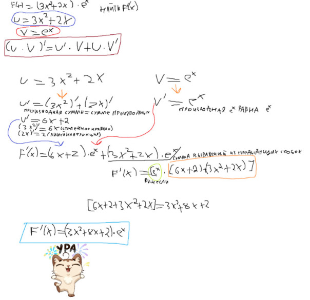 ошибка только в последнем эээ шаге ты написала: 6 + х = х = -6. это неверно!!!!!! выражение 6 + x - это часть производной (x + 6), умноженная на e^x. производная - это функция: f'(x) = e^x (x + 6). это окончательный ответ на задачу. уравнение 6 + x = 0 (или x + 6 = 0) ты решала, наверное, чтобы найти точку, где производная равна нулю (f'(x) = 0). но это уже другая задача, она не входила в исходную задачу (。﹏。) даже если решать f'(x) = 0: e^x (x + 6) = 0 так как e^x никогда не равен нулю (ни при каких x), то: x + 6 = 0 x = -6 это критическая точка функции, но это не часть нахождения самой производной....... получаем: нахождение производной выполнено правильно УМНИЦА!!!!!хлопаю f'(x) = e^x (x + 6) решение уравнения f'(x) = 0 (находжение x = -6) - это дополнительный шаг, не требовавшийся в задаче. если наша цель была только найти производную, то этот шаг был лишним а так ответ правильн.ый вроде (❁´◡`❁) |