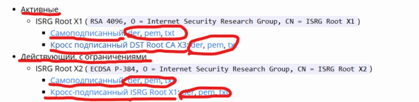Legro Mentoruri, в любом формате? Активные или Действующий, с ограничениями? Самоподписанный или Кросс-подписанный ISRG Root X1 или вообще Кросс подписанный DST Root CA X3