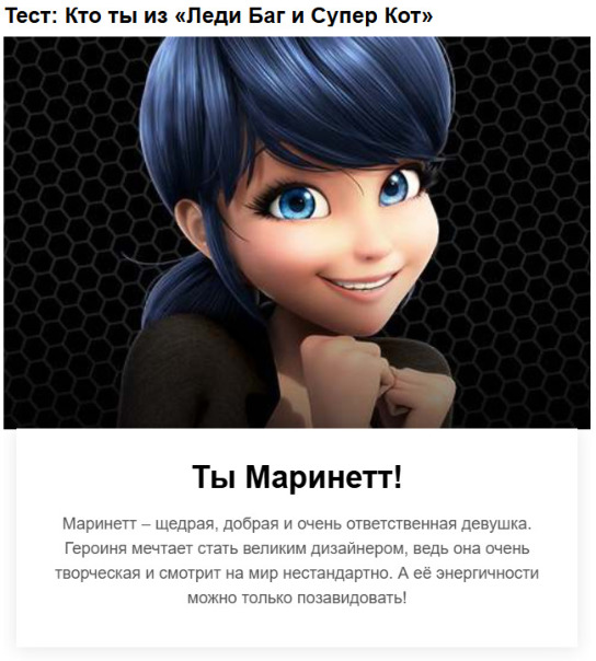 Я прошёл тест "Кто ты из «Ледибаг и Суперкот»" =) =) =) Я Маринетт обычная девочка живущая самой обычной жизнью!!! А кто ты???????? O_o